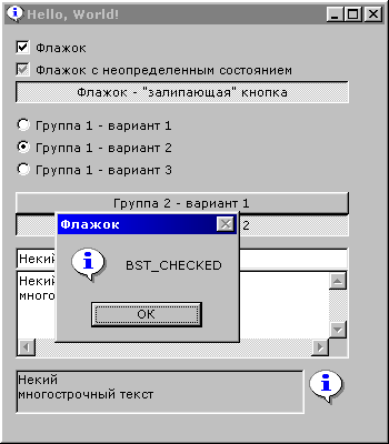 . . . . . const ID_CHECKBOX_1 = $101; ID_CHECKBOX_2 = $102; . . . . . ctl := CreateWindowEx ( 0, 'BUTTON', 'Флажок', WS_CHILD or WS_VISIBLE or BS_AUTOCHECKBOX, 10, 10, 150, 20, Wnd, ID_CHECKBOX_1, HInstance, nil ); . . . . . ctl := CreateWindowEx ( 0, 'BUTTON', 'Флажок с неопределенным состоянием', WS_CHILD or WS_VISIBLE or BS_AUTO3STATE, 10, 30, 300, 20, Wnd, ID_CHECKBOX_2, HInstance, nil ); . . . . .
