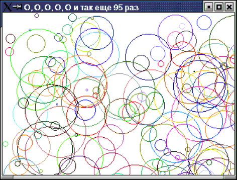 4. Нарисуйте в окне 100 окружностей. Цвет, координаты центра и радиус выбирать случайным образом.