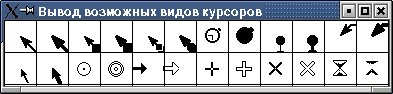 . Эта функция принимает идентификатор формы, и возвращает дескриптор на созданный курсор. Список возможных шрифтовых идентификаторов находится в файле /usr/include/X11/cursorfont.h