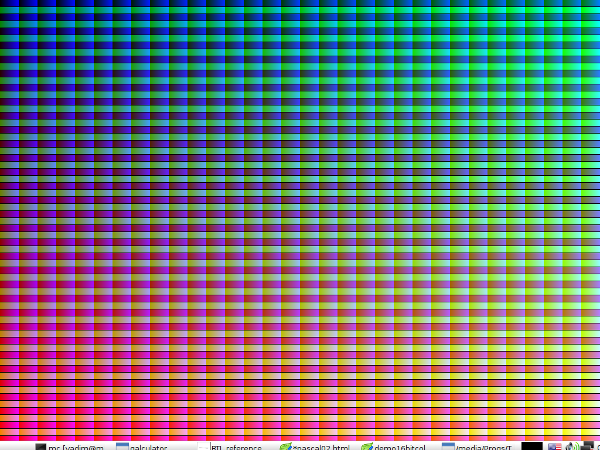 В информации, выданой моим видеоадаптером, написано, что он может отображать 65536 цветов. Было бы крайне любопытно взглянуть, как выглядит цвет сидящий под тем или иным номером. Для этого была составлена следующая программка, в которой последовательно рисуются 65536 квадратиков каждый из которых имет номер цвета от 0 до 65535: