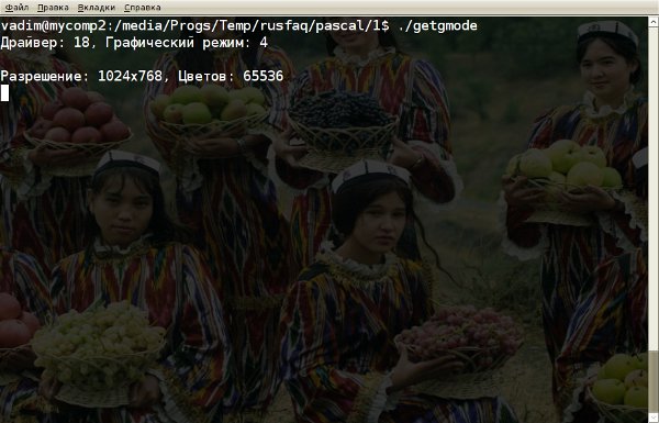 Program getgmode; Uses ptcGraph; Var Driver, Mode: SmallInt; Begin DetectGraph(Driver, Mode); WriteLn('Драйвер: ', Driver, ', Графический режим: ', Mode); ReadLn; InitGraph(Driver, Mode, ''); WriteLn('Разрешение: ', GetMaxX+1,'x',GetMaxY+1, ', Цветов: ', GetMaxColor+1); ReadLn; CloseGraph; End.