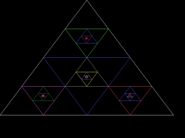 Program TriaFractal; Uses ptcGraph, ptcCrt; Type TTriaPoints = array[0..3] of PointType; // Координаты для рисования треугольника // Рекурсивная процедура для рисования треугольников // внутри заданного треугольника // Параметры: // Points - координаты внешнего треугольника // N - уровень вложенности процедуры Procedure Triangle1(Points: TTriaPoints; N: Integer); Var Points1: TTriaPoints; Begin If N>0 Then Begin Delay(200); SetColor(Random(14)+1); // Случайный цвет рисования. Чёрный нам, естественно, не нужен // Вычисление новых координат треугольника Points1[0].X:=(Points[1].X+Points[0].X) div 2; Points1[0].Y:=(Points[1].Y+Points[0].Y) div 2; Points1[1].X:=(Points[2].X+Points[0].X) div 2; Points1[1].Y:=(Points[2].Y+Points[0].Y) div 2; Points1[2].X:=(Points[1].X+Points[2].X) div 2; Points1[2].Y:=(Points[1].Y+Points[2].Y) div 2; Points1[3].X:=Points1[0].X; Points1[3].Y:=Points1[0].Y; DrawPoly(4, Points1); // Рисование треугольника Triangle1(Points1, N-1); // Рекурсивный вызов для рисования внутри End; End; Var Driver: SmallInt; // Номер драйвера Mode : SmallInt; // Номер графического режима Points: TTriaPoints; Begin Randomize; // Установка графического режима Driver:=VGA; Mode:=VGAHi; InitGraph(Driver, Mode, ''); // Большой треугольник Points[0].X:=0; Points[0].Y:=400; Points[1].X:=600; Points[1].Y:=400; Points[2].X:=300; Points[2].Y:=0; Points[3].X:=Points[0].X; Points[3].Y:=Points[0].Y; DrawPoly(4, Points); Triangle1(Points, 6); // Верхний треугольник Points[0].X:=150; Points[0].Y:=200; Points[1].X:=450; Points[1].Y:=200; Points[2].X:=300; Points[2].Y:=0; Points[3].X:=Points[0].X; Points[3].Y:=Points[0].Y; Triangle1(Points, 6); // Левый треугольник Points[0].X:=0; Points[0].Y:=400; Points[1].X:=300; Points[1].Y:=400; Points[2].X:=150; Points[2].Y:=200; Points[3].X:=Points[0].X; Points[3].Y:=Points[0].Y; Triangle1(Points, 6); // Правый треугольник Points[0].X:=300; Points[0].Y:=400; Points[1].X:=600; Points[1].Y:=400; Points[2].X:=450; Points[2].Y:=200; Points[3].X:=Points[0].X; Points[3].Y:=Points[0].Y; Triangle1(Points, 6); ReadLn; CloseGraph; End.