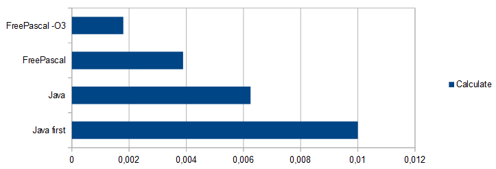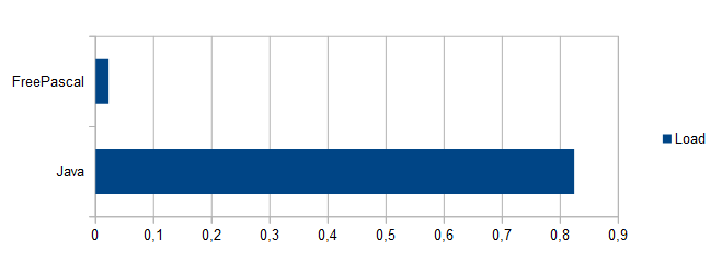 Вот что ещё важно отметить по поводу Java: как правило, при первом запуске теста всё происходит медленнее, чем на втором и последующем запусках. Это связано с особенностью Java-машины, которая кэширует код, ну и на следующих запусках она запускает уже кэшированный код, а не загружает его опять. Так же там есть какие-то оптимизации, а так же псевдослучайные факторы (на системе работают всякие фоновые процессы), так что результат измерения времени получается всегда разный как для кода на Java, так и для кода на FPC, хотя для Java разброс по времени значительно больше.