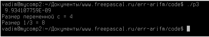 program primer3; Var a : Single; b : Single; c : Single; Begin a := 1; b := 3; c := a / b; c := c - 1/3; WriteLn(c); WriteLn('Размер переменной с = ', sizeof(c)); WriteLn('Размер 1/3 = ', sizeof(1/3)); End.