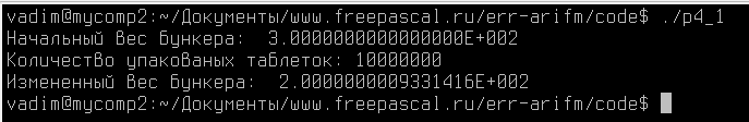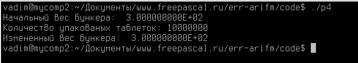 program primer4_1; Var a: Double; // вес таблетки в кг c: Double; // продукции в бункере в кг n: Double;// количество циклов Begin c := 300; // Вес таблеток в бункере a := 0.00001; // вес таблетки n := 10000000; // Количество упакованых таблеток WriteLn('Начальный вес бункера: ', c); For n := 1 To n Do c := c - a; //одна таблетка забирается упаковочной машиной WriteLn('Количество упакованых таблеток: ', n); WriteLn('Измененный вес бункера: ', c); End.