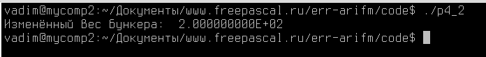program primer4_2; Var bunker, bunker1, tablet, tablet1, compens: Single; n, i: longint; Begin tablet := 0.00001; // вес таблетки tablet1 := 0.0; // вес таблетки с учетом ошибки в предыдущих итерациях bunker := 300.0; // исходный вес бункера bunker1 := 0.0; // вес бункера после очередной итерации compens := 0.0; // компенсация веса таблетки n := 10000000; // количество циклов For i := 0 To n Do Begin // вес таблетки с компенсацией ошибки tablet1 := tablet - compens; // вес бункера после вычета скомпенсированной таблетки bunker1 := bunker - tablet1; // вычисление компенсации для следующей итерации compens := (bunker - bunker1) - tablet1; // новый вес бункера bunker := bunker - tablet1; End; WriteLn('Изменённый вес бункера: ', bunker); End.
