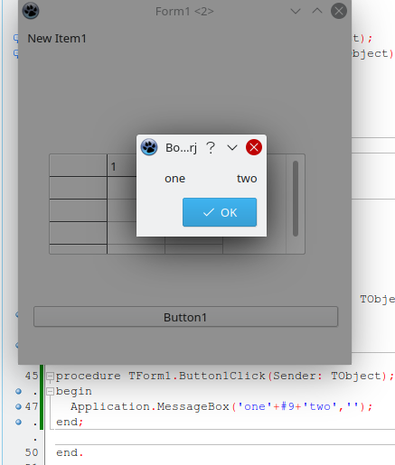 Почему диалоговое окно не отображает табуляцию как в Delphi, а выводит два слова слитно?