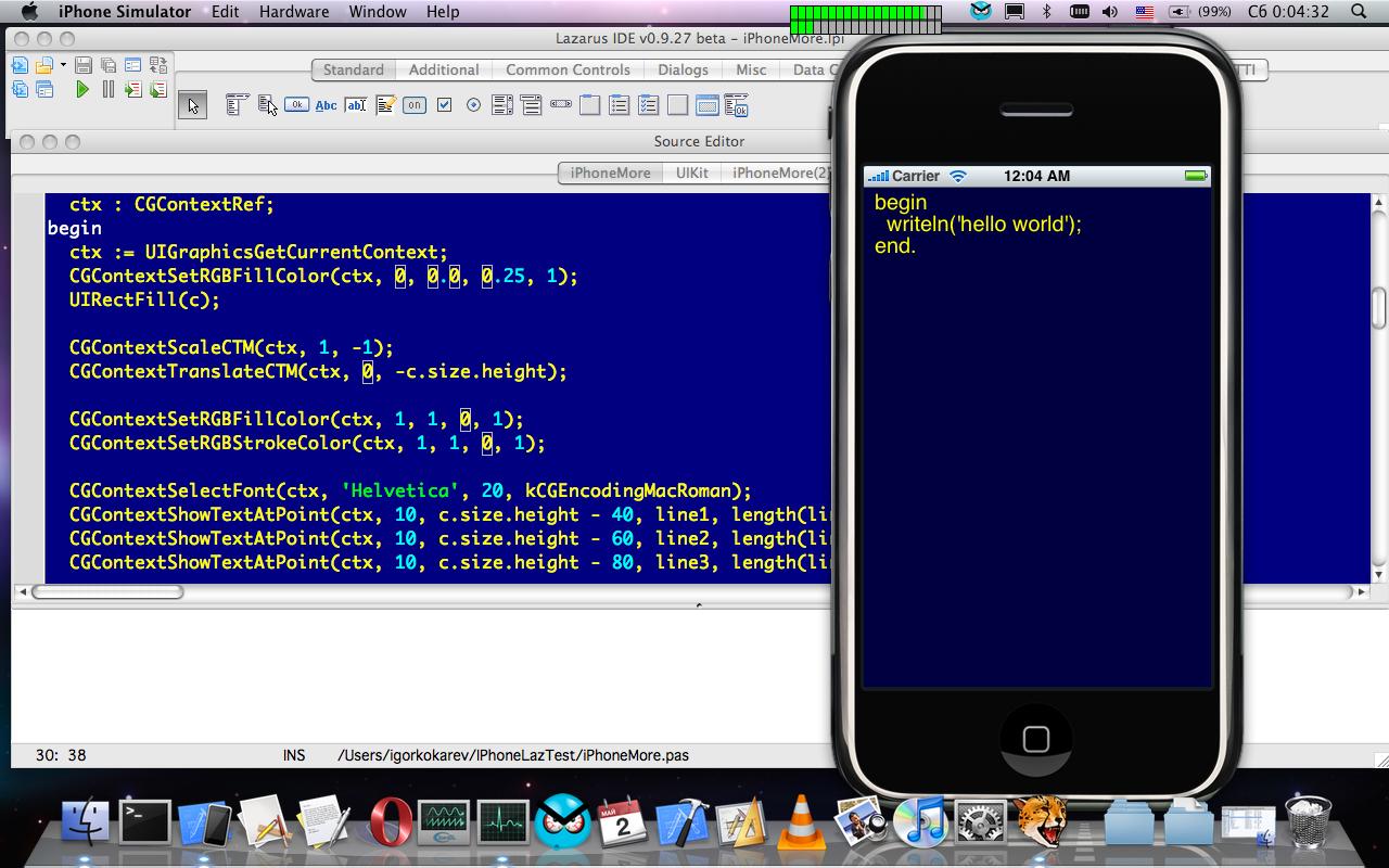 Если кто-нибудь уже пробовал писать программы под iPhone на freepascal/lazarus, поделитесь опытом, как написать простенькую программу вида "Hello World".