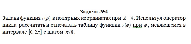 (zad4)Задана функция в полярных координатах при . Используя оператор цикла рассчитать и отпечатать таблицу функции при , меняющемся в интервале с шагом .
