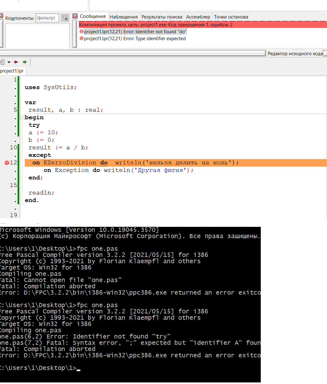 Только Lazarus всё равно будет сообщать о возникшем исключении вызвав остановку выполнения программы даже при удачной компиляции, и окно консоли будет пустым. Чтобы извещение в нём появилось нужно нажать снова запуск и извещение 'Делить на ноль нельзя!' в консоли появится, после чего можно закрывать окно консоли. Непонятно где в настройках Lazarus отключить это чтобы не останавливал исполнение программы. А так всё работает. Может кому из новичков пригодится, то прилагаю скан, как всё должно выглядеть.